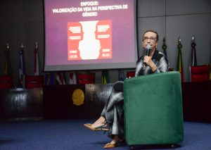 A palestra ‘Feminicídio e valorização da vida’ foi ministrada por Eugênia Villa, delegada da Polícia Civil do Piauí e doutora em Direito e Políticas Públicas. Eugênia é também superintendente de Gestão de Riscos da Secretaria de Segurança Pública do Piauí e professora titular da Universidade Estadual do Piauí. “Muitas vezes, as mulheres não conseguem reconhecer quando estão em uma situação de violência psicológica, pois cada uma delas vive essa experiência de forma singular. Em muitos casos, a mulher envolvida em um contexto de violência, inicialmente, se sente confortável ao interpretar o ciúme como cuidado, não como violência. Romantiza a situação de violência. Somente quando essa violência evolui para agressões físicas é que ela passa a perceber a gravidade da situação”, ressaltou Eugênia Villa.