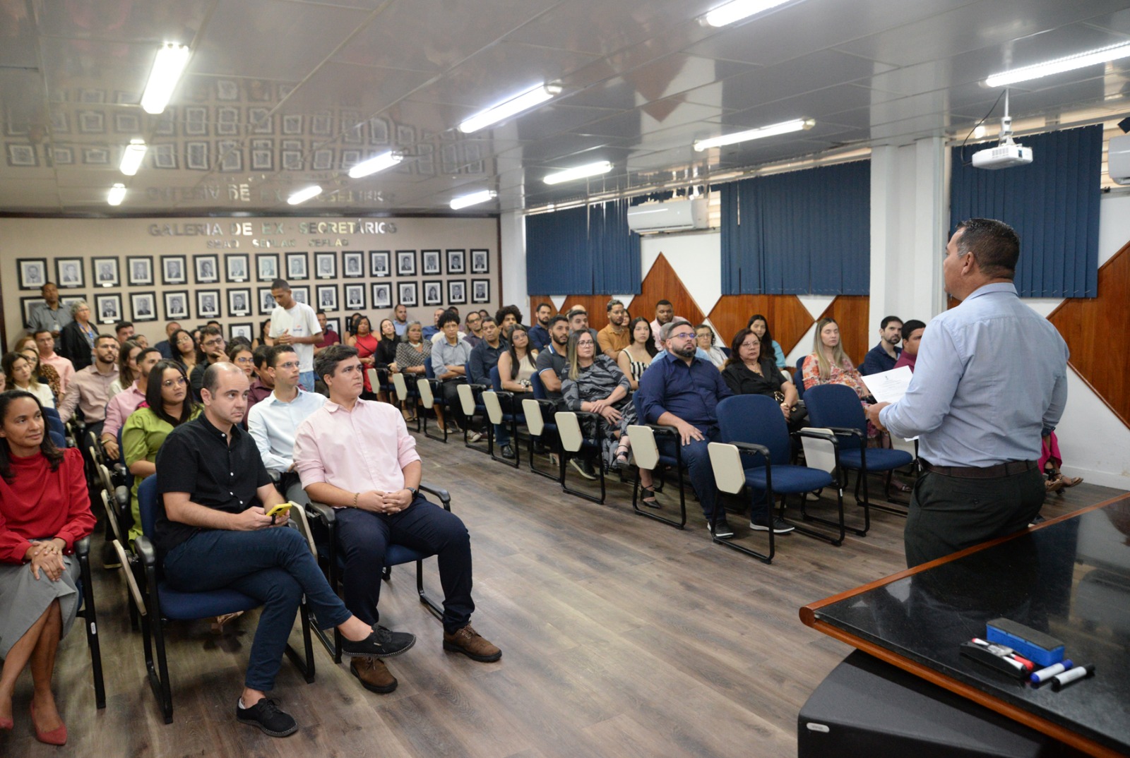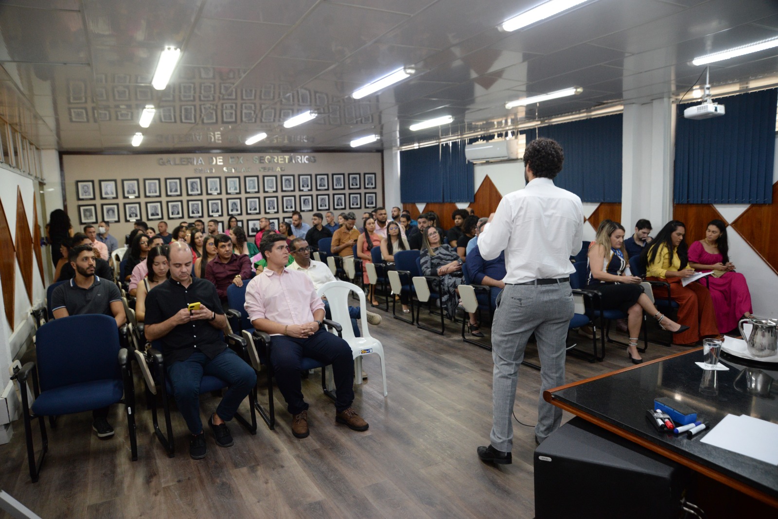 Após a solenidade de recepção, os novos contadores do Estado participaram de palestras. A primeira delas foi ministrada pelo gestor governamental Thiago Menezes, da Superintendência Especial de Atos Legislativos (Superlegis), que apresentou a estrutura administrativa do Poder Executivo Estadual, detalhando a organização das secretarias e suas respectivas competências, e também orientou os contadores sobre como acessar e pesquisar a legislação estadual. “Essa iniciativa da Sead visa integrar os novos servidores e proporcionar a eles um conhecimento sólido sobre a estrutura e a legislação, que permeiam suas atividades, contribuindo para um desempenho mais eficaz e alinhado com as diretrizes governamentais”, destacou.